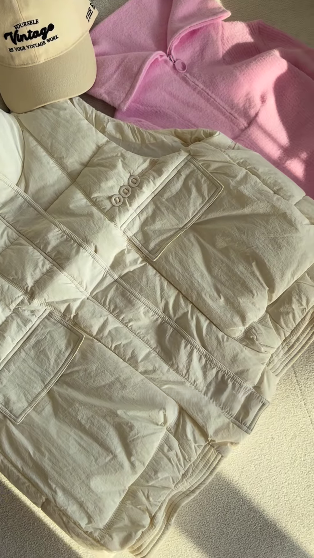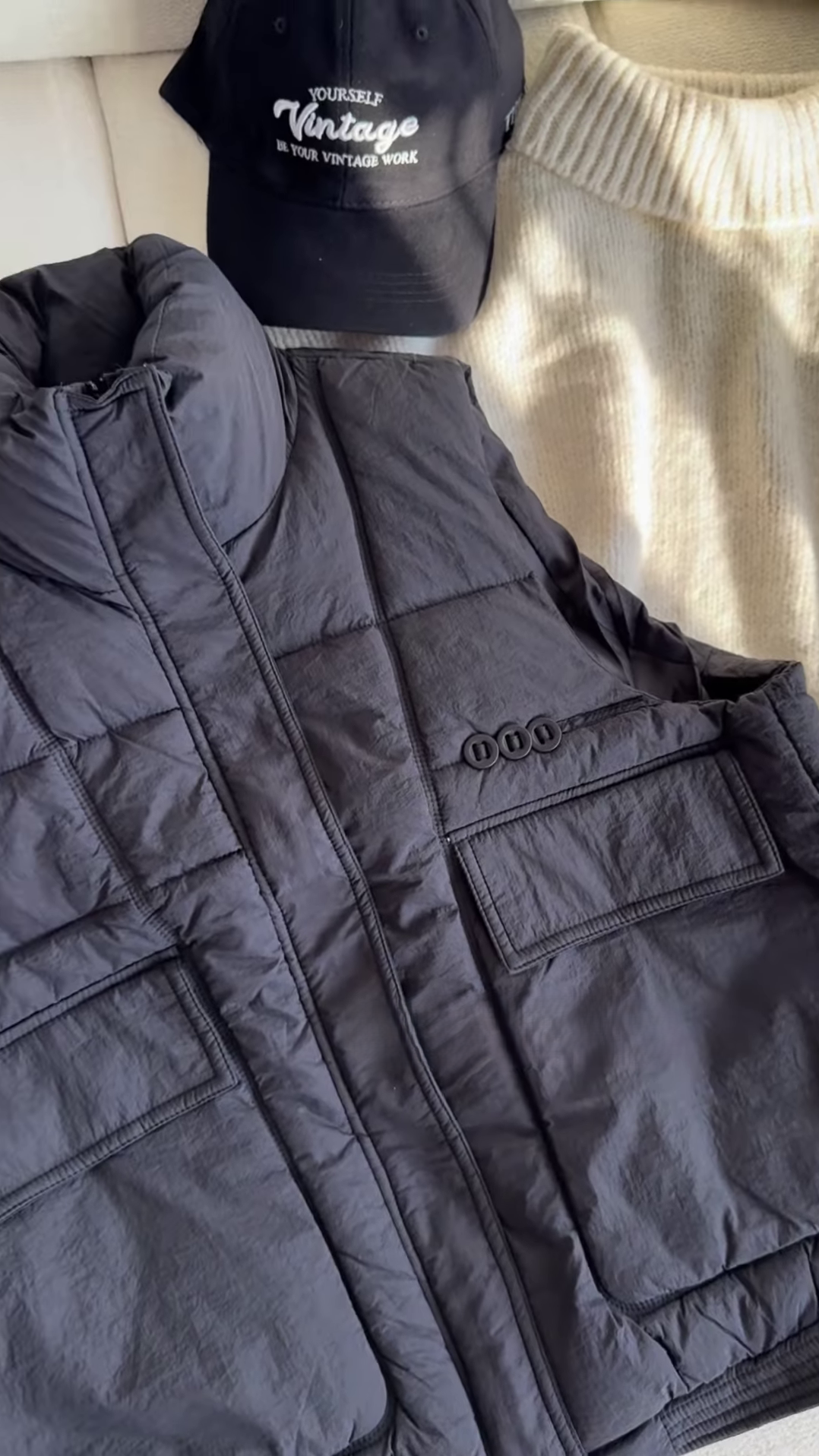 At the heart of the ensemble lies a quilted brown vest, lightweight yet structured, designed to keep you warm without compromising on style. Its padded design, practical front pockets, and clean lines make it a versatile layering piece – perfect over chunky knits, slim turtlenecks, or flowy dresses. The neutral brown tone radiates a grounded, natural charm, blending effortlessly with both casual and refined outfits. πŸ§₯🀎